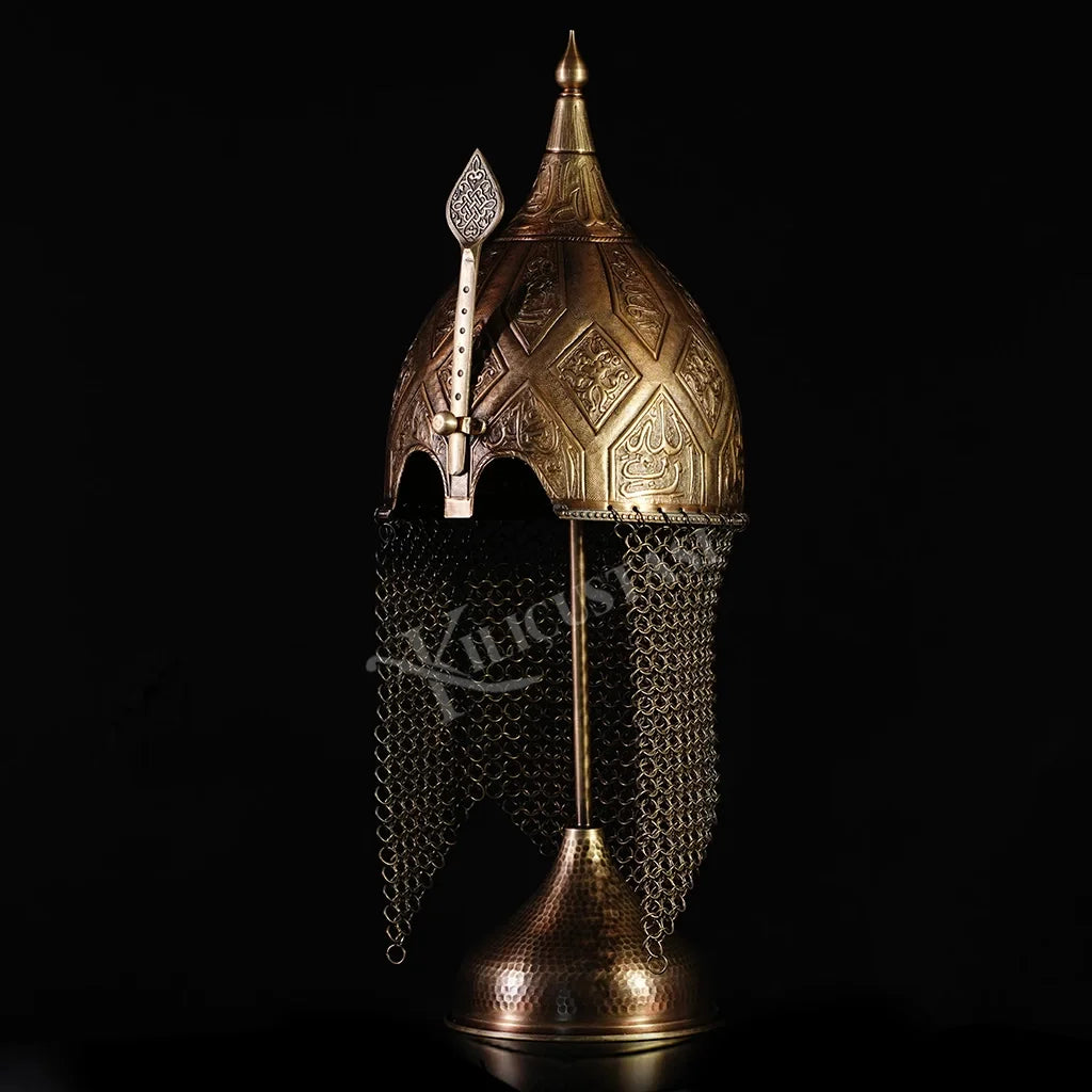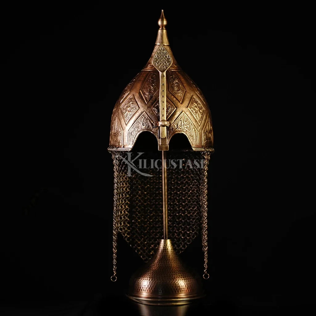 Osmanlı döneminde kullanılan merasim miğferleri arasında yer alan bu özel parça, tamamen el işçiliğiyle üretilmiştir. %100 saf bakırdan yapılan gövdesi ve özenli işlemeleriyle tarihî bir duruş ve güçlü bir görsel etki sunar.