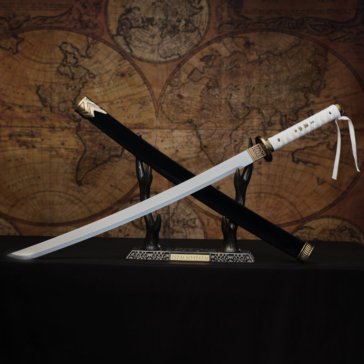 Ürün, görsellerde yer alan kılıf ve sehpa ile birlikte gönderilir. Kılıç üzerine isteğe bağlı özel yazı yazdırılabilir. Özel yazı alanı boş bırakıldığında ürün, görsellerdeki standart yazı ile teslim edilir.