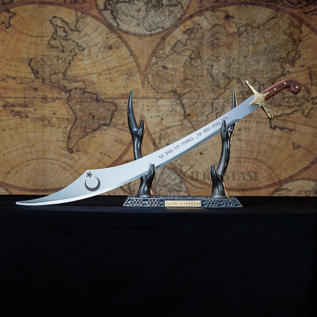 Ürün, özel geyikboynuzu sehpası ile birlikte gönderilir. Dileyenler ekstra ücretle tamamlayıcı ürünler arasından duvar tablosu ekleyebilir. Kılıç üzerine isteğe bağlı özel yazı yazdırılabilir; özel yazı alanı boş bırakıldığında ürün, görsellerde yer alan standart yazı ile teslim edilir.