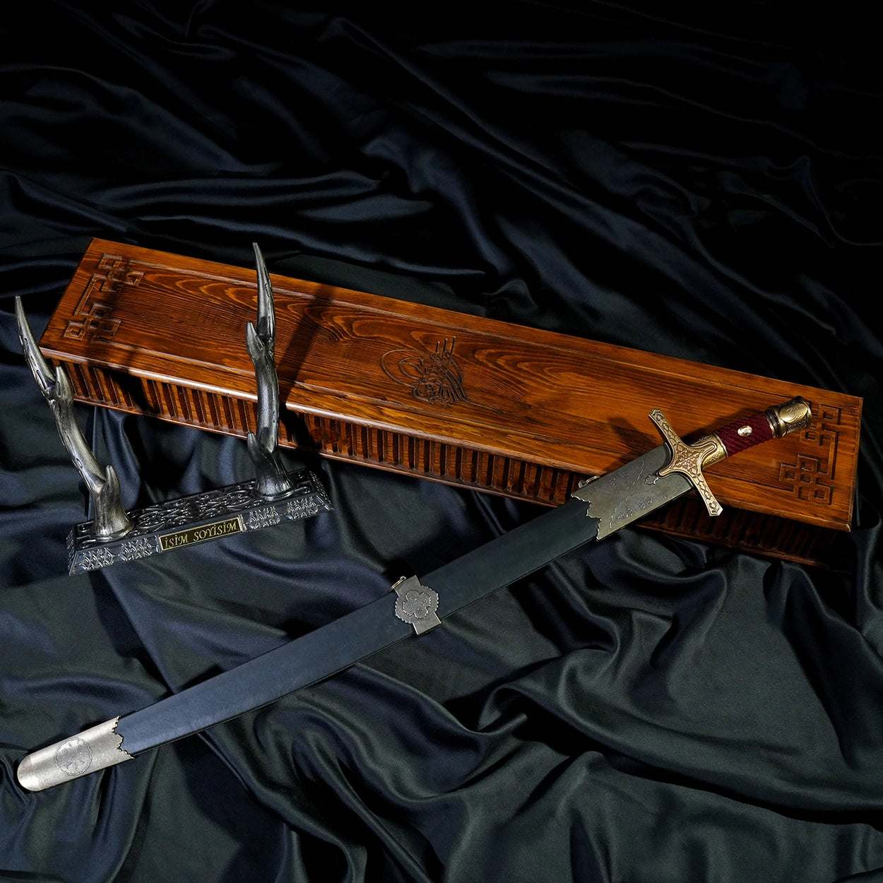 Bordo renk; gücü, asaleti, kararlılığı ve devlet ihtişamını temsil eder. Bu özel renk tonu, kılıca hem görsel ihtişam hem de tarihî bir ağırlık kazandırır. Model, özel ahşap kutusu, geyikboynuzu sehpası ve kılıfı ile birlikte tam set halinde gönderilmektedir.