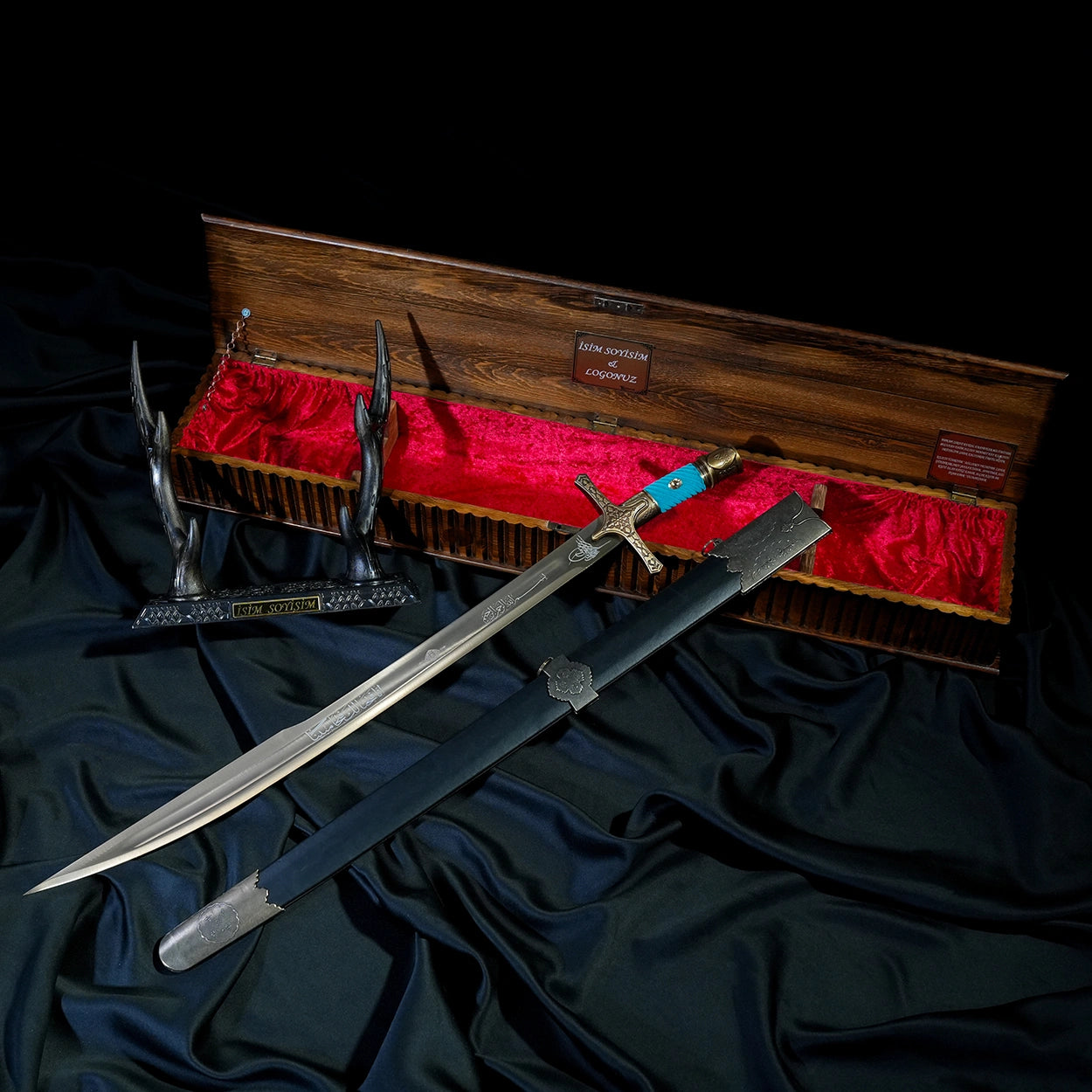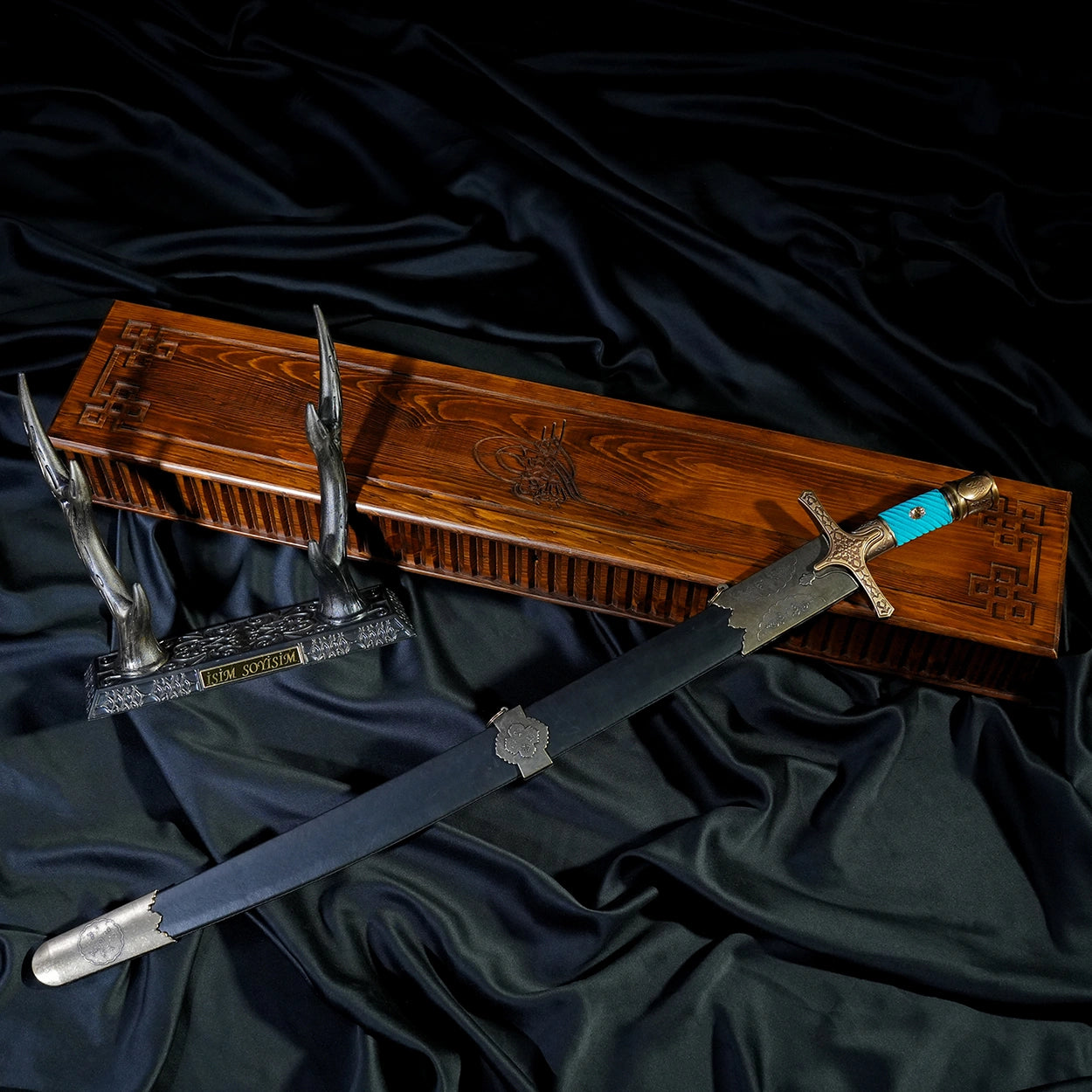 Turkuaz renk tonu; Türk-İslam tarihinde gökyüzünü, kudreti ve ilahi korumayı temsil eder. Bu özel renk seçimi, kılıca hem estetik hem de derin bir anlam kazandırır. Model, özel ahşap kutusu, geyikboynuzu sehpası ve kılıfı ile birlikte tam set olarak gönderilmektedir.
