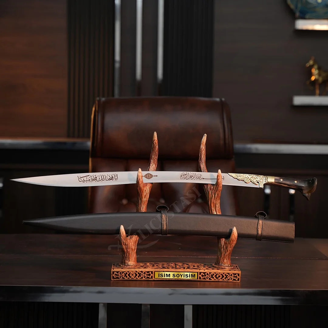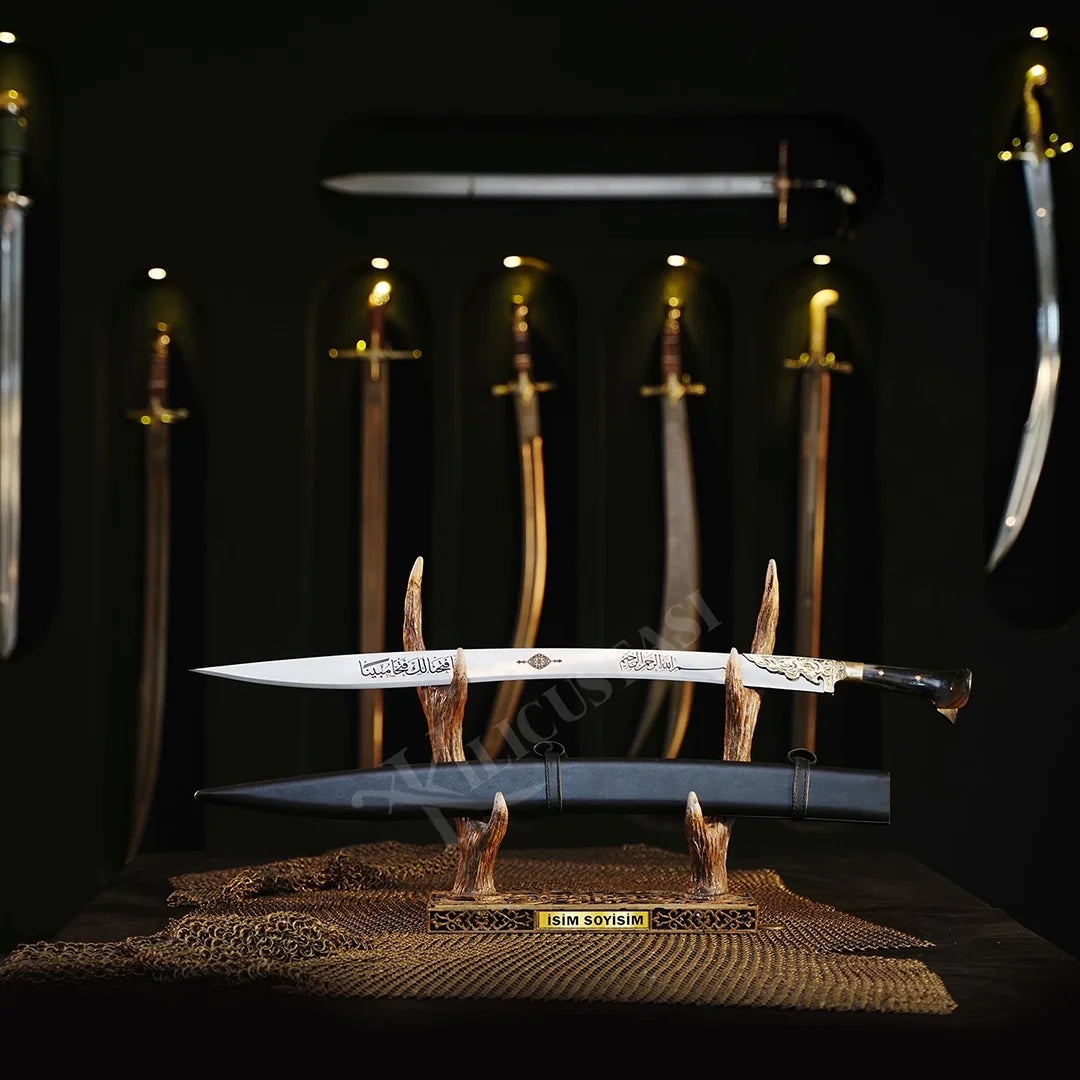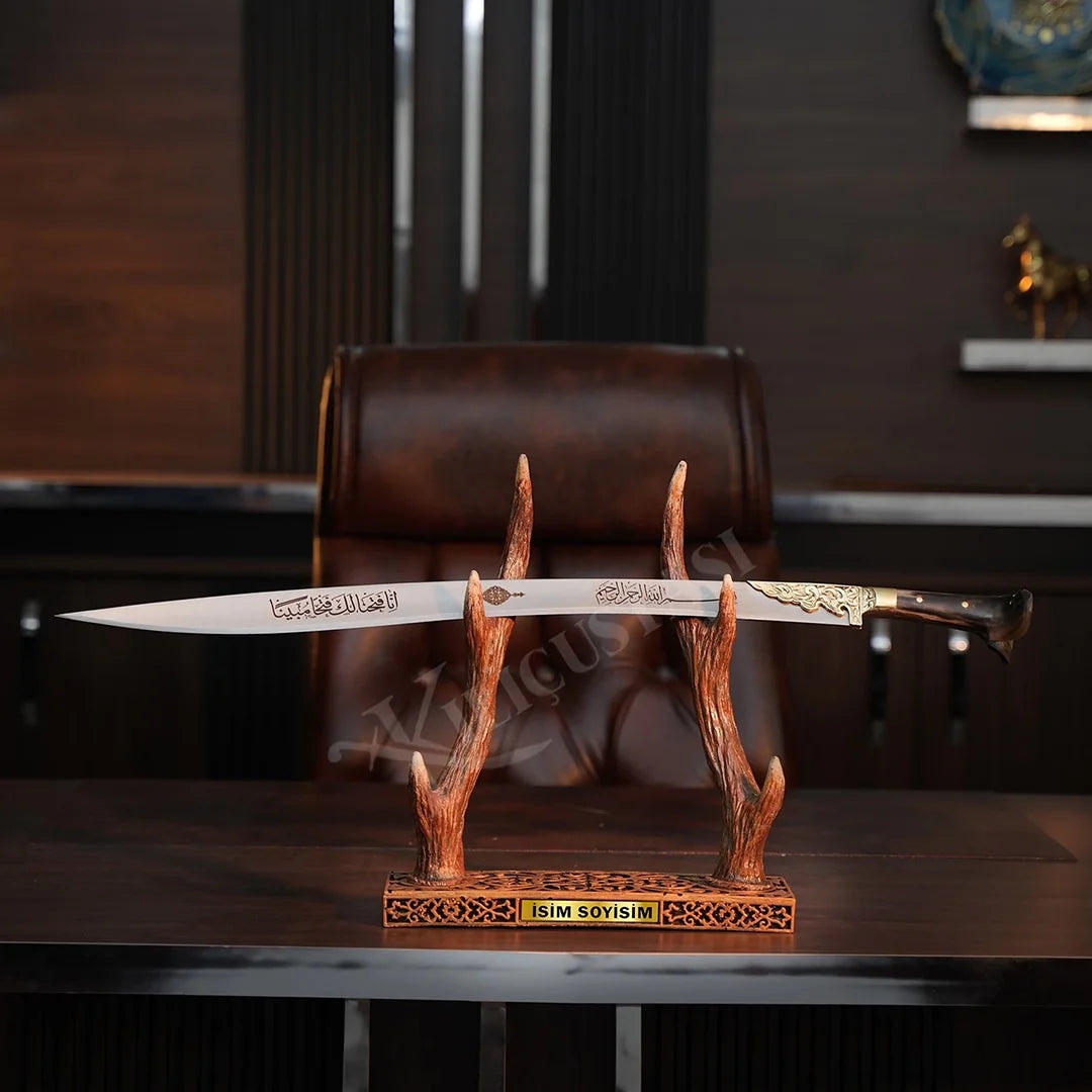 Ürün, özel geyikboynuzu sehpası ile birlikte gönderilir. Dileyen kullanıcılar için kılıf ve duvara asma tablosu opsiyonel olarak temin edilebilir. Ayrıca kılıç üzerine isteğe bağlı özel yazı eklenebilir.